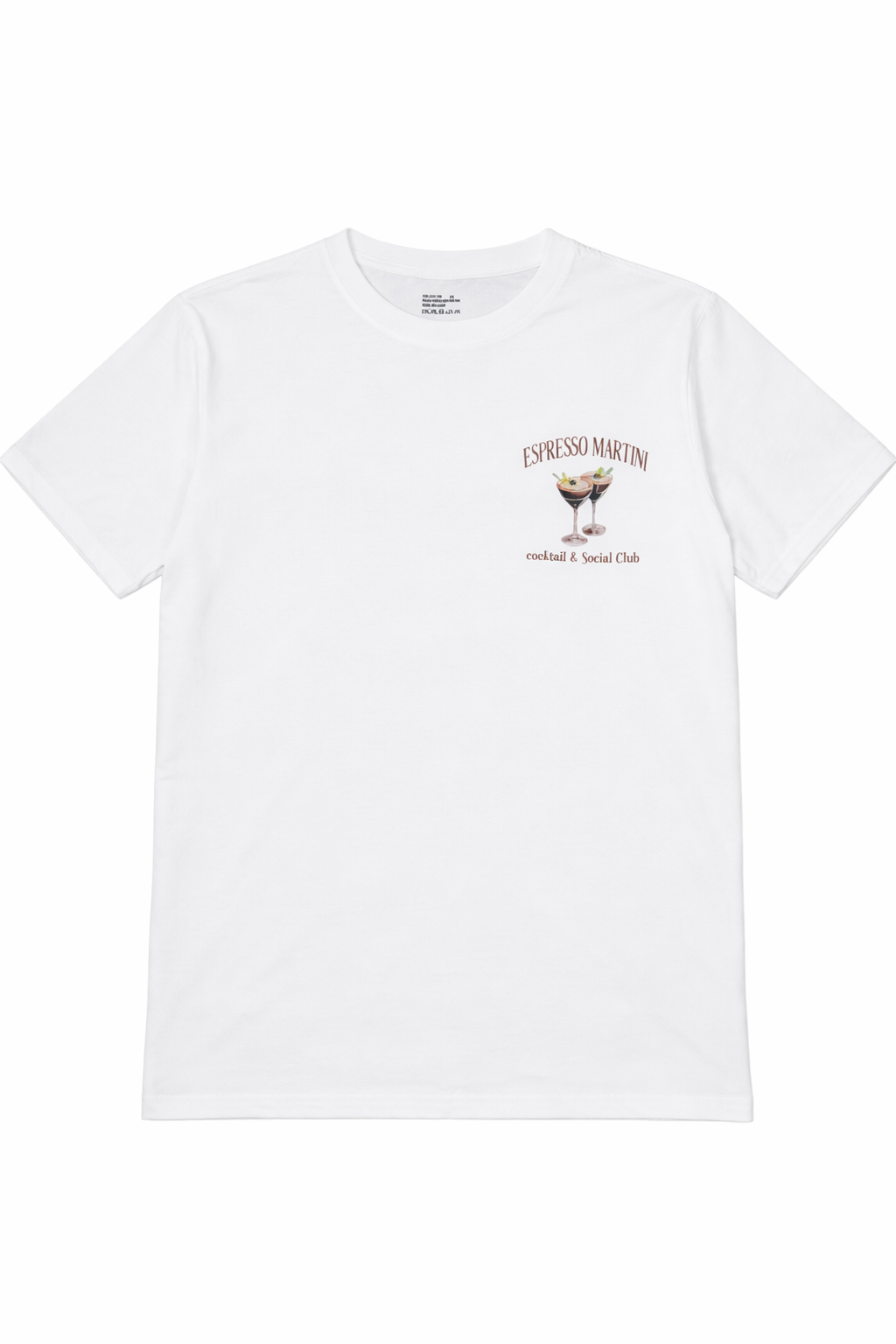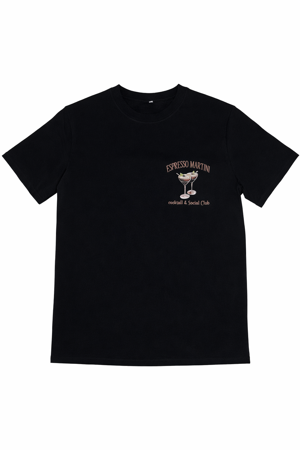Stilren T-shirt med trendigt tryck både fram och bak. På framsidan finns ett mindre tryck med två espresso martinis och texten “Espresso Martini – Cocktail & Social Club”. På baksidan sitter ett större motiv med samma stilrena design – perfekt statement-plagg för dig som älskar cocktails och sociala kvällar.